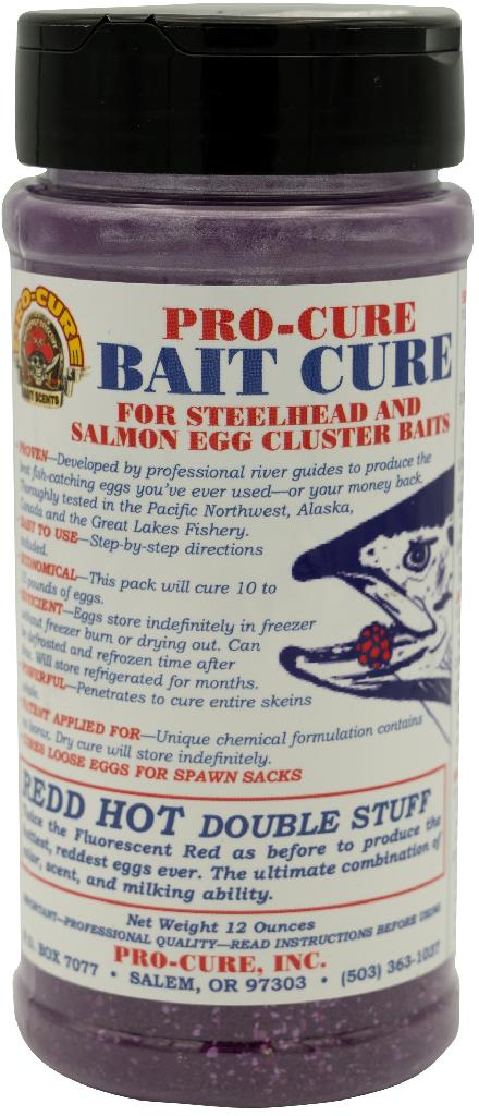 Twice the red produces the reddest, hottest fluorescent red eggs. A must for salmon and high water steelhead. With all of the new great cures they have introduced there are still a tremendous amount of anglers who refuse to give up on some thing that works so well. On the market for over 20 years the original PRO-CURE formulas still kick serious butt. So if it ain't broke don't fix it.